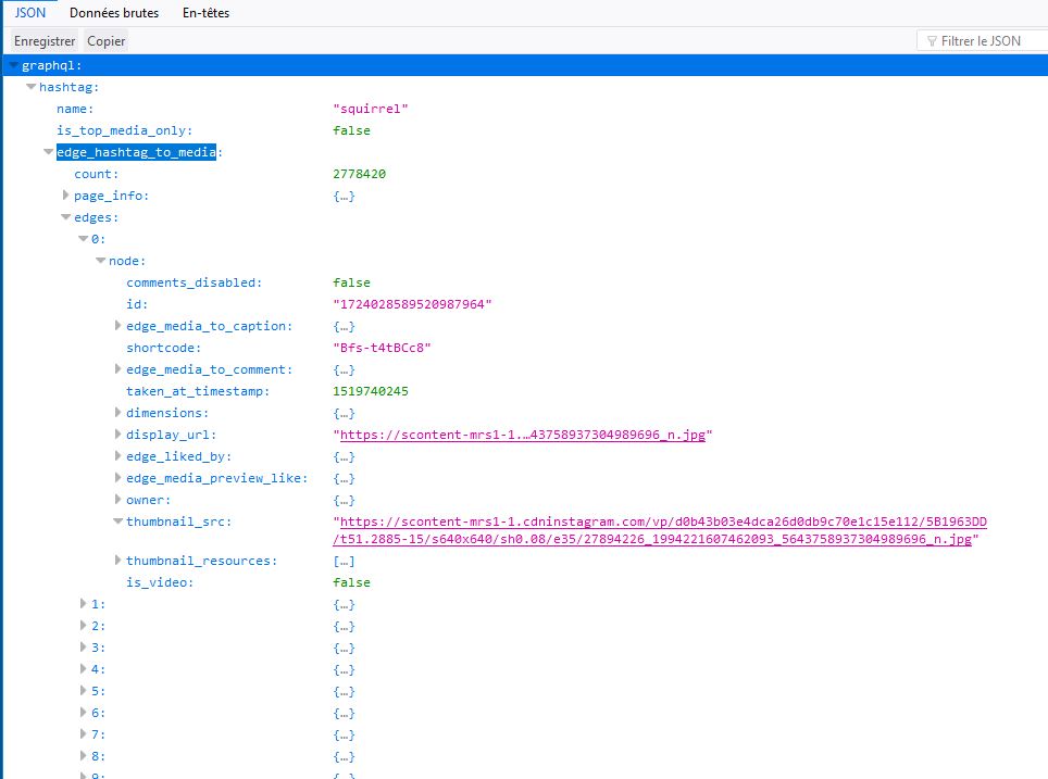 - la première permet de récupérer le fichier GraphQL (format Json) depuis https://www.instagram.com/explore/tags/squirrel/?__a=1