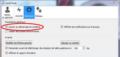 L’assistant de connexion laisse alors la place à l’interface de gestion du client NextCloud. En ouvrant l’onglet « Généraux » vous pouvez vérifier que le logiciel client est configuré pour démarrer automatiquement.