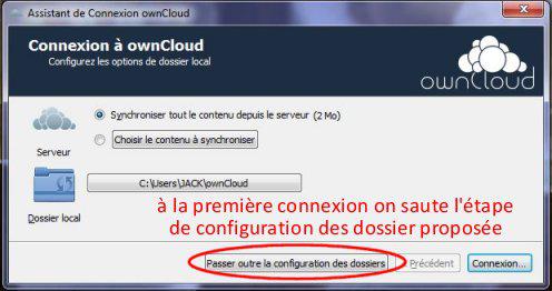 Pour bénéficier de la configuration de la synchronisation multi-dossier, on saute l’étape de configuration des dossier en utilisant le bouton « Passer outre la configuration des dossiers ».