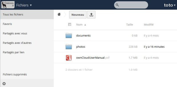 La connexion à votre espace de stockage en ligne doit vous amener sur la page de gestion de vos fichiers qui contient par défaut un dossier « Documents », un dossier « Photos » et le pdf du manuel de l’utilisateur (en anglais).