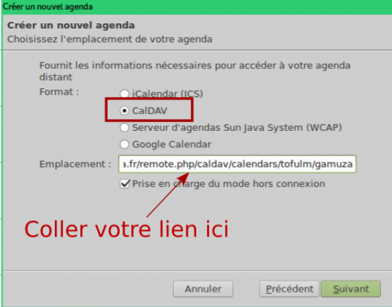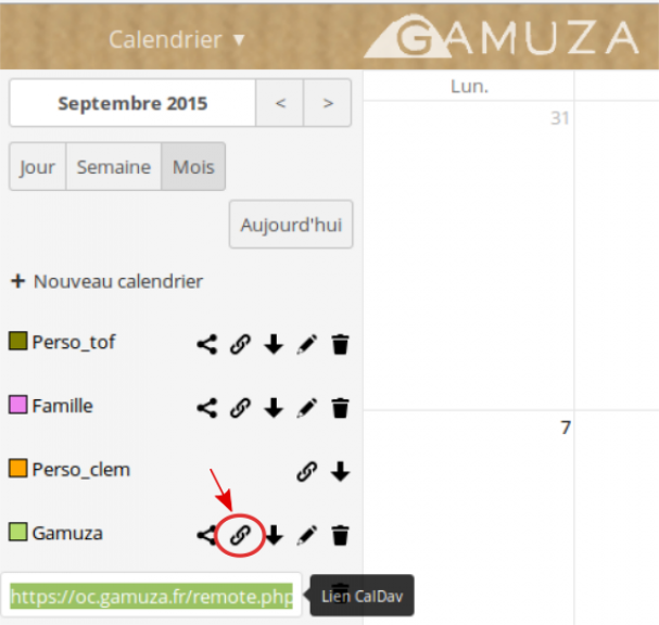 - Copier le lien qui apparait quand on clique sur l’icône en forme de maillon de chaine (lien CalDav) :