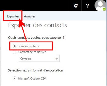 Dans le volet "Exporter des contacts", choisir les contacts à exporter (ici on a choisi "Tous les contacts") puis le format de l’export (par défaut un seul choix possible : "Microsoft Outlook CSV" [1]). Cliquez sur "Exporter" pour valider.