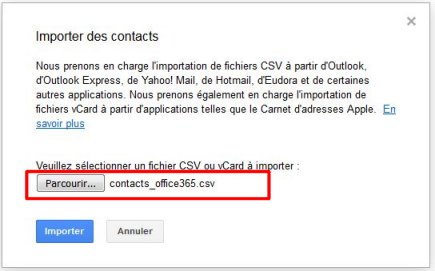 L’échange entre ces 2 applications de mail concurrentes se fait en 2 temps : exportation au format CSV des contacts dans Office 365 puis importation dans Gmail.