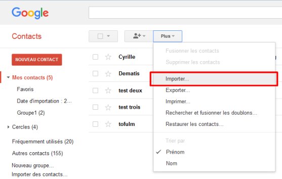 Ouvrir l’outil de contact de Gmail puis dans le menu "Plus" ouvrir l’outil "Importer..."