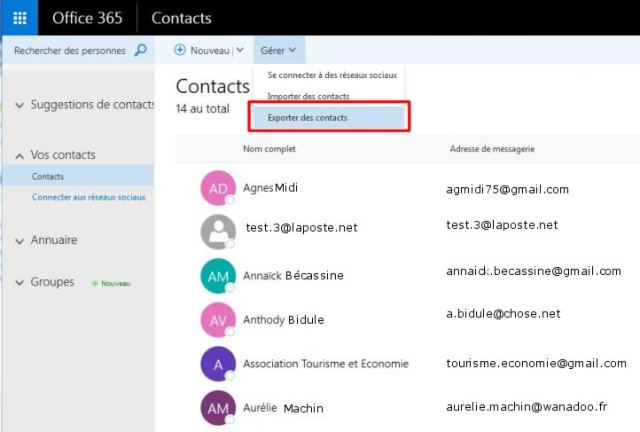 Ouvrir l’outil de contact d’Office 365 et sélectionner le sous-menu "Exporter des contacts" du menu "Gérer"